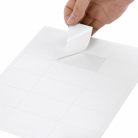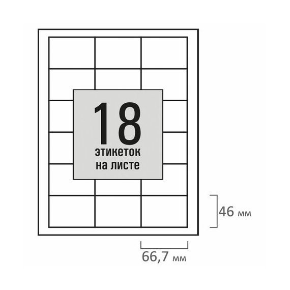 Изготовлены из самоклеящейся матовой бумаги плотностью 80 г/м2. Надежно приклеиваются к поверхности любой формы и материала. Картонная упаковка содержит 50 листов формата А4, на каждом листе – 18 этикеток размером 66,7х46 мм.
