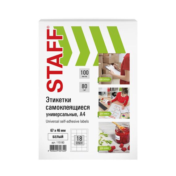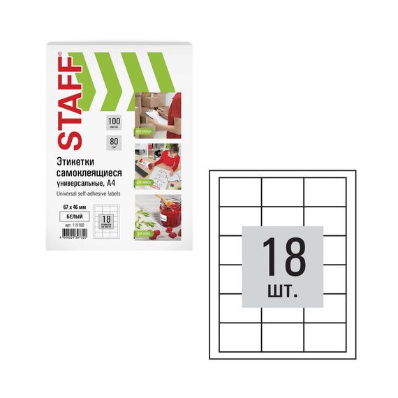 Этикетка самоклеящаяся 67х46мм, 18 этикеток, белая, 80 г/м2, 100 листов, STAFF, 115180