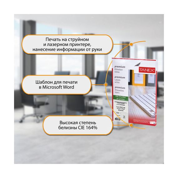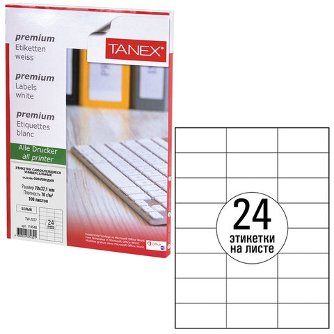 Этикетка самоклеящаяся 70х37,1 мм, 24 этикетки, белая, 70 г/м2, 100 листов, TANEX, сырье Финляндия, 114548, TW-2037