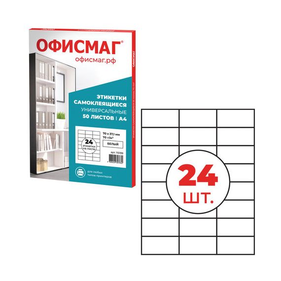 Этикетка самоклеящаяся 70х37,1 мм, 24 этикетки, белая, 70 г/м2, 50 листов, ОФИСМАГ, сырье Финляндия, 115199