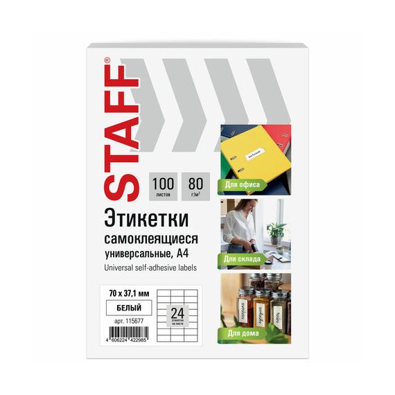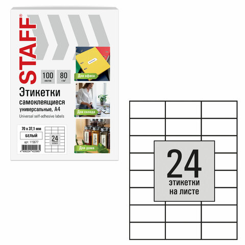 Этикетка самоклеящаяся 70х37,1 мм, 24 этикетки, белая, 80 г/м2, 100 листов, STAFF BASIC, 115677