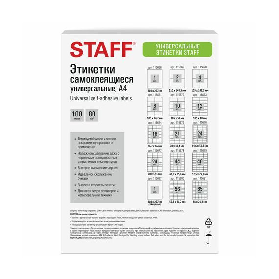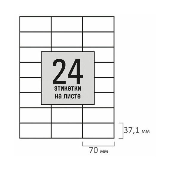 Изготовлены из самоклеящейся матовой бумаги плотностью 80 г/м2. Надежно приклеиваются к поверхности любой формы и материала. Картонная упаковка содержит 100 листов формата А4, на каждом листе – 24 этикетки размером 70х37,1 мм.