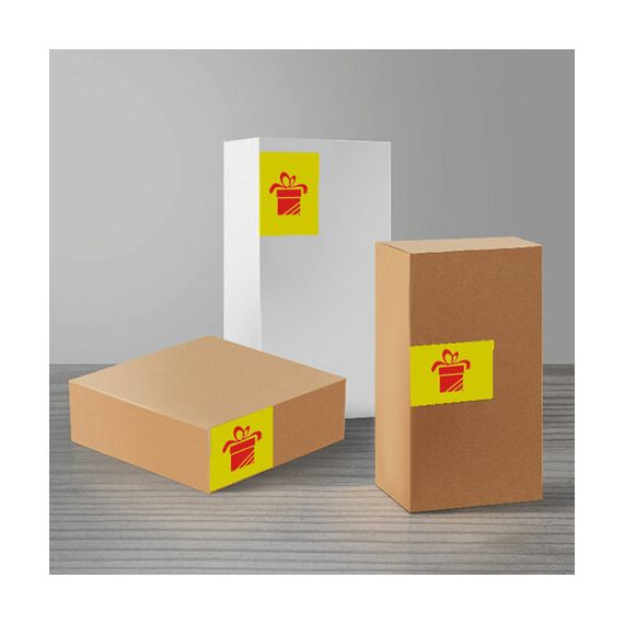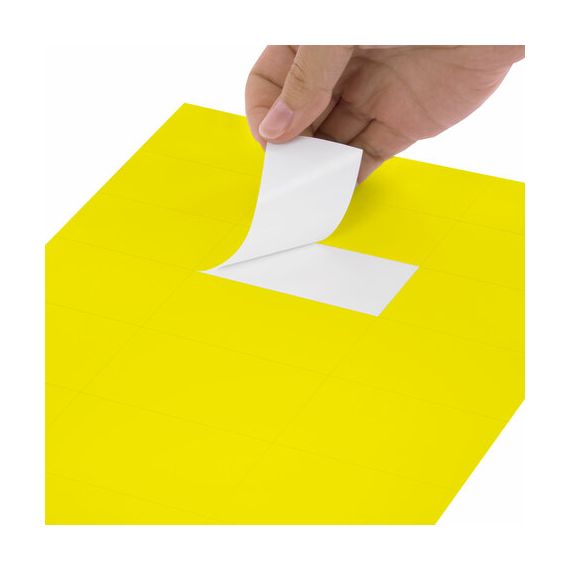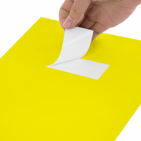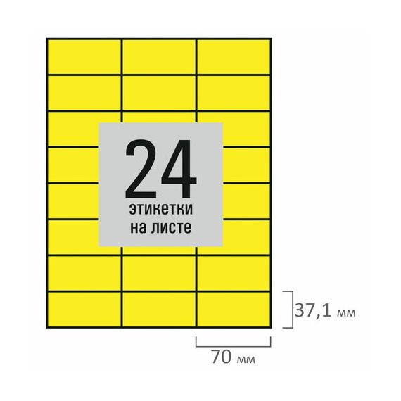 Изготовлены из самоклеящейся матовой бумаги плотностью 80 г/м2. Надежно приклеиваются к поверхности любой формы и материала. Картонная упаковка содержит 50 листов формата А4, на каждом листе – 24 желтых этикетки размером 70х37,1 мм.