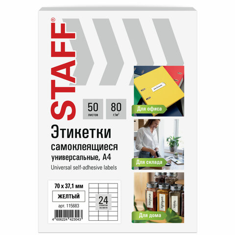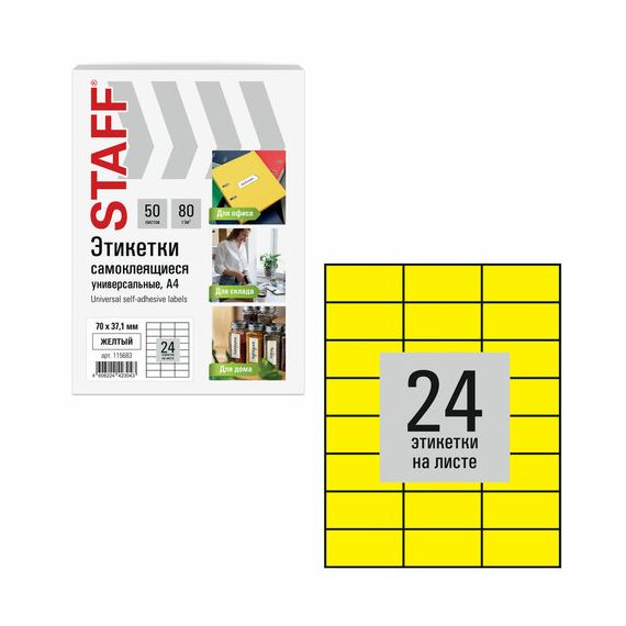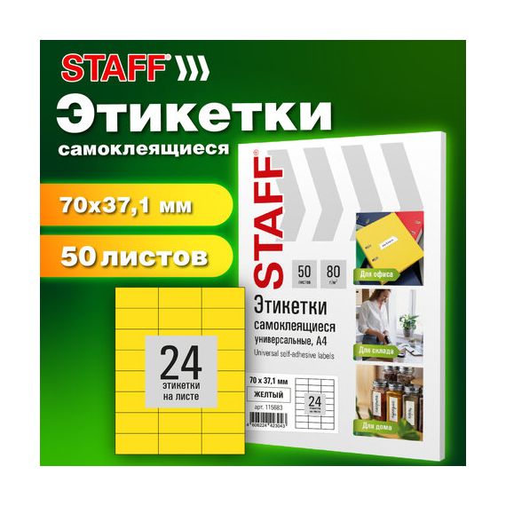 Этикетка самоклеящаяся 70х37,1 мм, 24 этикетки, желтая, 80 г/м2, 50 листов, STAFF BASIC, 115683