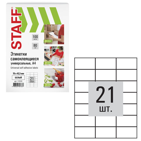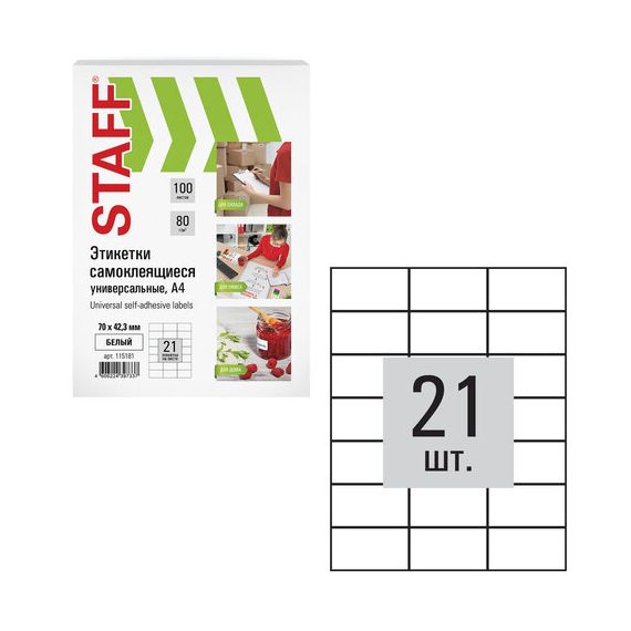 Этикетка самоклеящаяся 70х42,3 мм, 21 этикетка, белая, 80 г/м2, 100 листов, STAFF, 115181