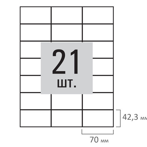 Изготовлены из матовой бумаги белого цвета плотностью 80 г/м2. Картонная упаковка содержит 100 листов формата А4, на каждом листе – двадцать одна этикетка размером 70х42,3 мм.