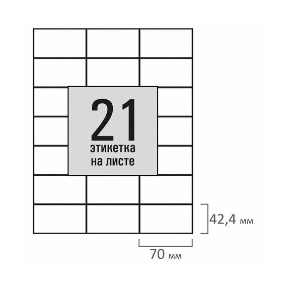 Изготовлены из самоклеящейся матовой бумаги плотностью 80 г/м2. Надежно приклеиваются к поверхности любой формы и материала. Картонная упаковка содержит 50 листов формата А4, на каждом листе – 21 этикетка размером 70х42,4 мм.