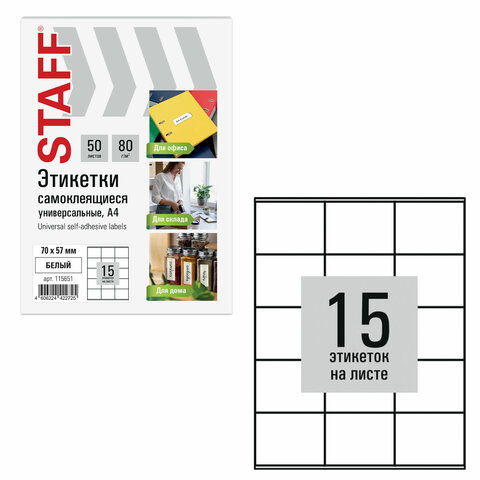 Этикетка самоклеящаяся 70х57 мм, 15 этикеток, белая, 80 г/м2, 50 листов, STAFF BASIC, 115651