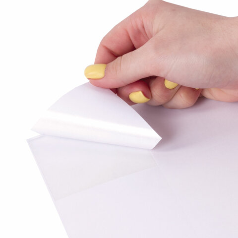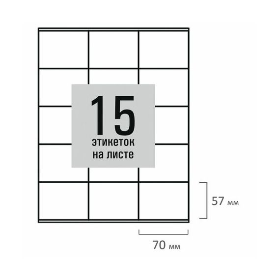 Изготовлены из самоклеящейся матовой бумаги плотностью 80 г/м2. Надежно приклеиваются к поверхности любой формы и материала. Картонная упаковка содержит 50 листов формата А4, на каждом листе – 15 этикеток размером 70х57 мм.