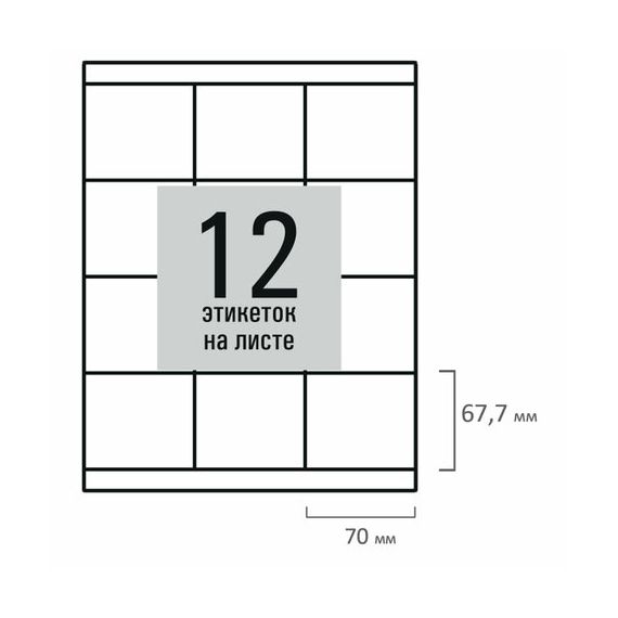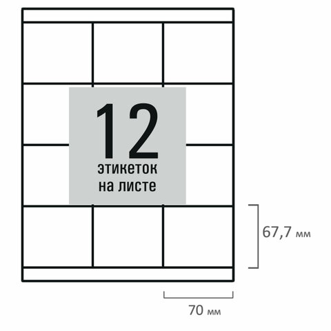 Изготовлены из самоклеящейся матовой бумаги плотностью 80 г/м2. Надежно приклеиваются к поверхности любой формы и материала. Картонная упаковка содержит 50 листов формата А4, на каждом листе – 12 этикеток размером 70х67,7 мм.
