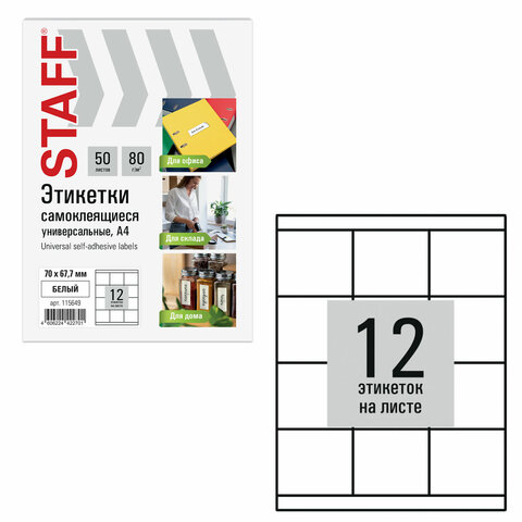Этикетка самоклеящаяся 70х67,7 мм, 12 этикеток, белая, 80 г/м2, 50 листов, STAFF BASIC, 115649