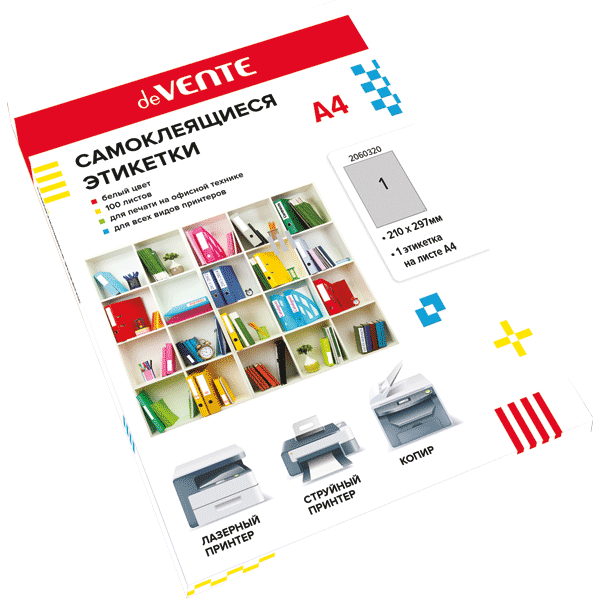 Этикетки самоклеящиеся "deVENTE" A4, белые, 210x297мм, 1 этикетка на листе, 100 листов в картонной коробке