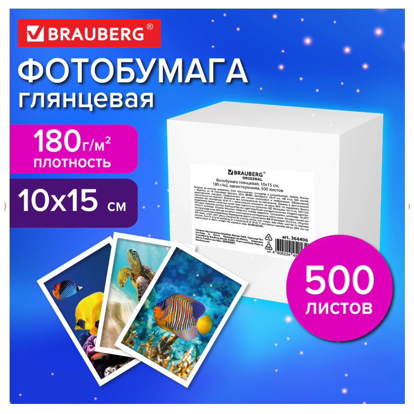Фотобумага глянцевая, 10х15 см, 180 г/м2, односторонняя, 500 листов, BRAUBERG ORIGINAL