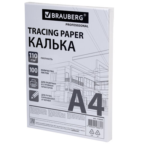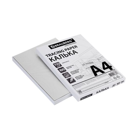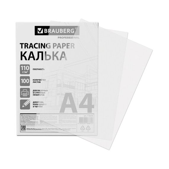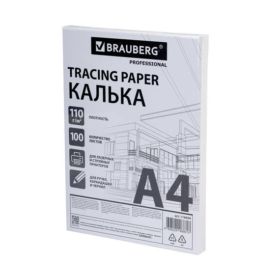 Калька А4 ВЫСОКОЙ ПРОЗРАЧНОСТИ, ПЛОТНАЯ, для печати и творчества, 110 г/м2, 100 листов BRAUBERG, 116644