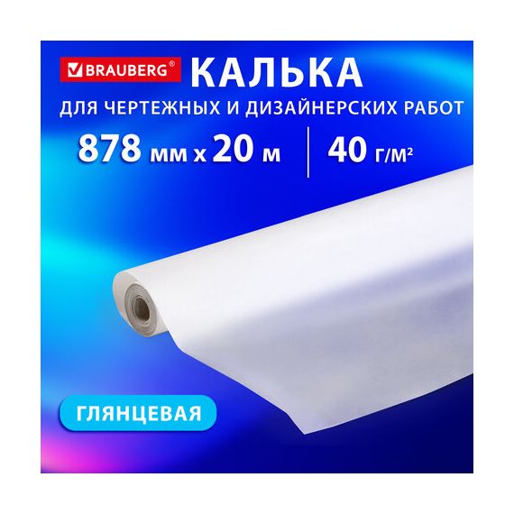Калька для чертежных и дизайнерских работ, рулон 878 мм х 20 м, 40 г/м2, BRAUBERG, 116373