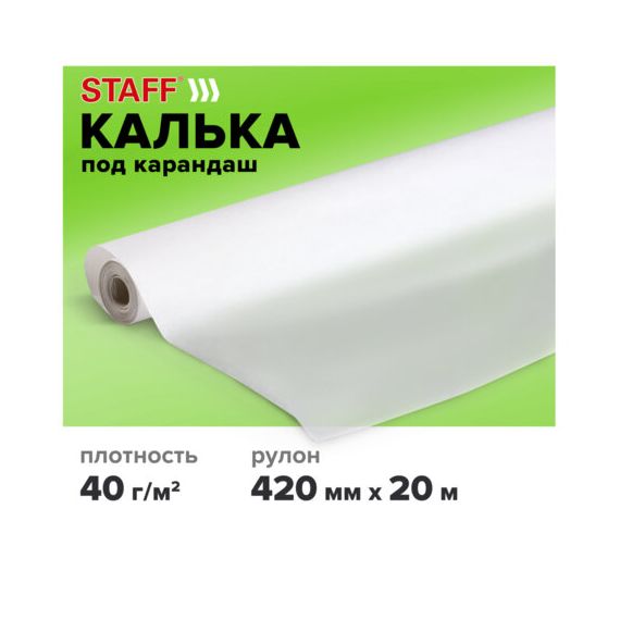 Калька под карандаш, рулон 420 мм х 20 м, плотность 40 г/м2, STAFF, 115505