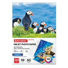 Глянцевая односторонняя фотобумага BRAUBERG подходит для всех типов струйных принтеров. Незаменима для печати ярких фотореалистичных изображений. Передает яркие, насыщенные цвета со множеством оттенков. Имеет формат А5 и плотность 230 г/м2, что исключает просвечивание изображения. Гладкая поверхность обеспечивает превосходное качество, а особый состав – идеальную цветопередачу. Печать возможна только водорастворимыми чернилами. Поставляется по 50 листов в картонной упаковке.