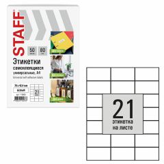 Изготовлены из самоклеящейся матовой бумаги плотностью 80 г/м2. Надежно приклеиваются к поверхности любой формы и материала. Картонная упаковка содержит 50 листов формата А4, на каждом листе – 21 этикетка размером 70х42,4 мм.