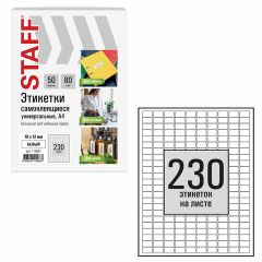 Изготовлены из самоклеящейся матовой бумаги плотностью 80 г/м2. Надежно приклеиваются к поверхности любой формы и материала. Картонная упаковка содержит 50 листов формата А4, на каждом листе – 230 этикеток размером 18х12 мм.