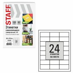 Изготовлены из самоклеящейся матовой бумаги плотностью 80 г/м2. Надежно приклеиваются к поверхности любой формы и материала. Картонная упаковка содержит 100 листов формата А4, на каждом листе – 24 этикетки размером 64,6х33,8 мм.