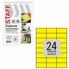 Изготовлены из самоклеящейся матовой бумаги плотностью 80 г/м2. Надежно приклеиваются к поверхности любой формы и материала. Картонная упаковка содержит 50 листов формата А4, на каждом листе – 24 желтых этикетки размером 70х37,1 мм.