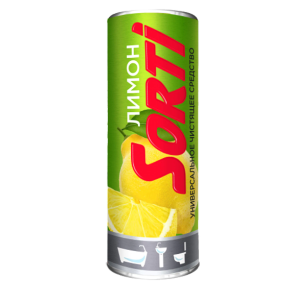 Универсальное чистящее средство SORTI "Лимон" предназначено для чистки ванн, раковин, кухонных плит, а также фаянсовых, эмалированных и керамических поверхностей.