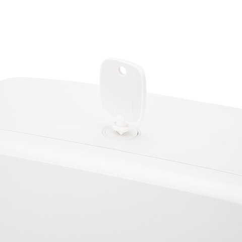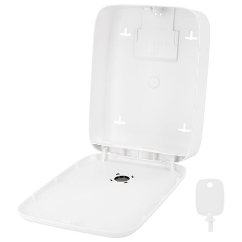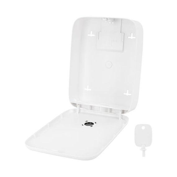 Диспенсер сочетается с расходными материалами других производителей. В конструкции предусмотрено окошко для контроля остатка полотенец. Оборудован самозахлопывающимся замком с ключом. В комплект входят крепежные материалы для установки. Размер – 360х265х100 мм.