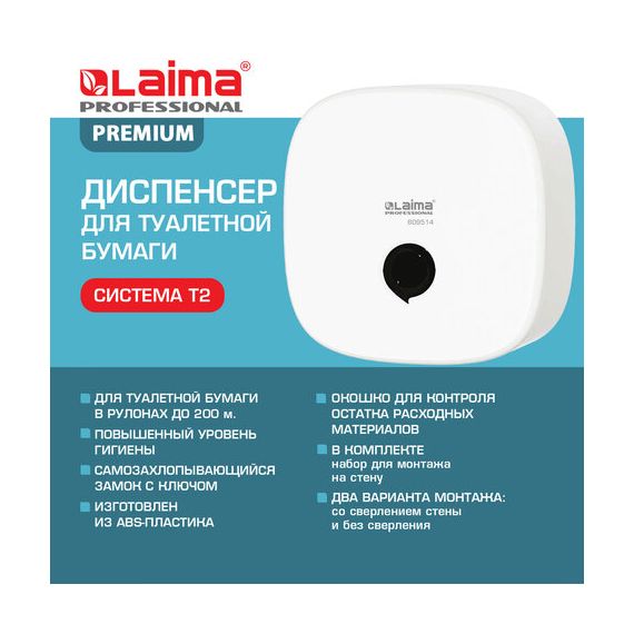 Диспенсер для туалетной бумаги LAIMA PROFESSIONAL PREMIUM (Система T2), малый, белый, ABS-пластик, 609514