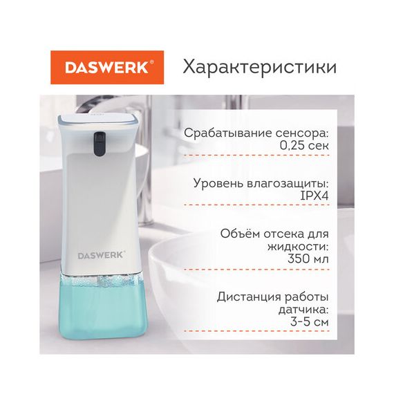 Сенсорный бесконтактный диспенсер для жидкого мыла/средства для посуды DASWERK обеспечивает максимальную гигиеничность и комфорт при мытье рук и мытье посуды.