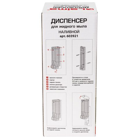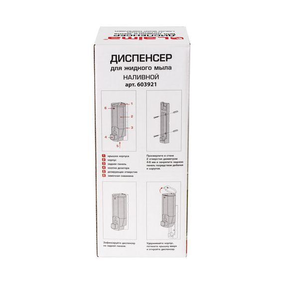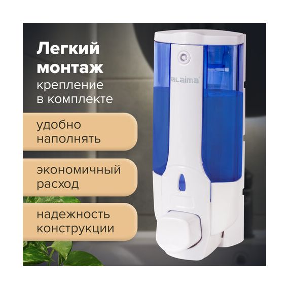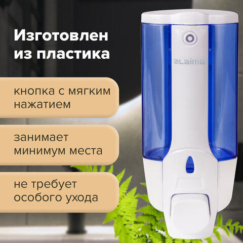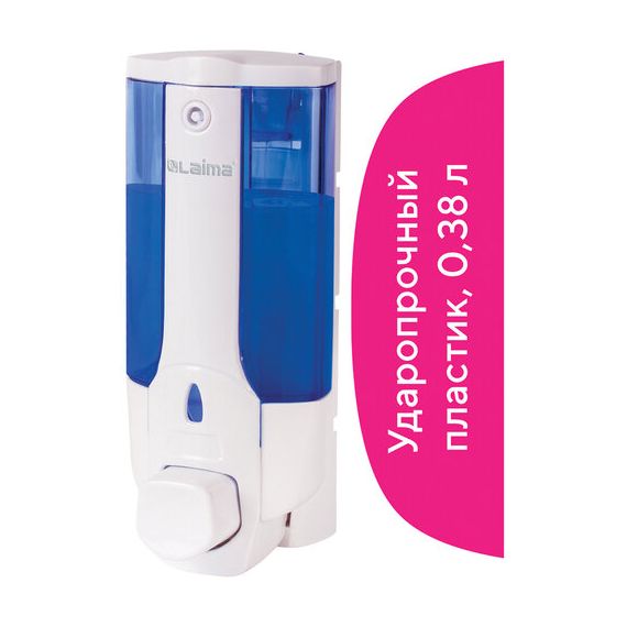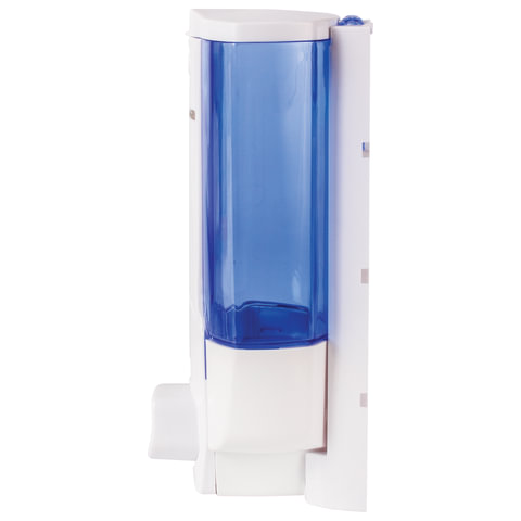 Корпус выполнен из ударопрочного пластика ABS. Выдача мыла осуществляется экономичными порциями. Дозатор сочетается с расходными материалами других производителей. Имеется окно для контроля уровня мыла. В комплект входят крепежные материалы.