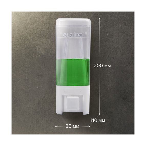 Корпус выполнен из пластика. Выдача мыла осуществляется экономичными порциями. Дозатор сочетается с расходными материалами других производителей. Имеется окно для контроля уровня мыла. В комплект входят крепежные материалы.