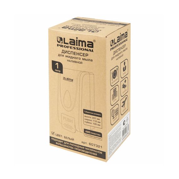 Корпус изготовлен из ударопрочного пластика ABS. Выдача мыла осуществляется экономичными порциями. Диспенсер сочетается с расходными материалами других производителей. Имеется окно для контроля уровня мыла. В комплект входят крепежные материалы. Тип – наливной. Объем – 1 л.