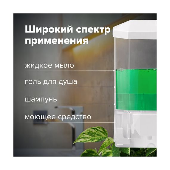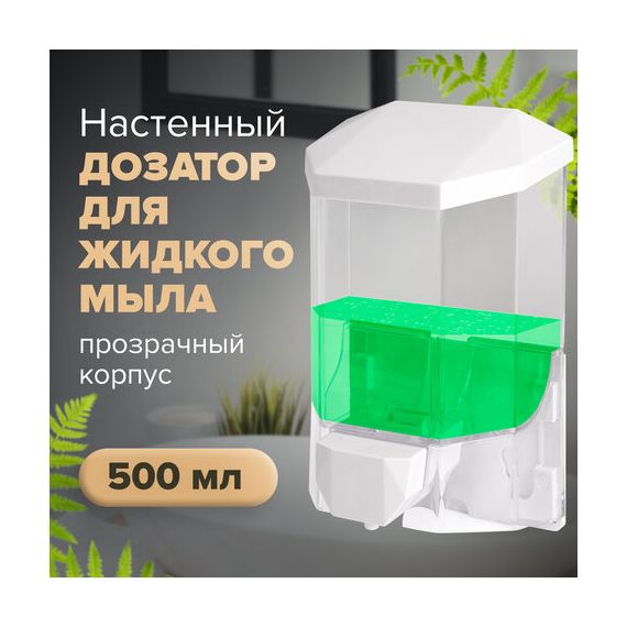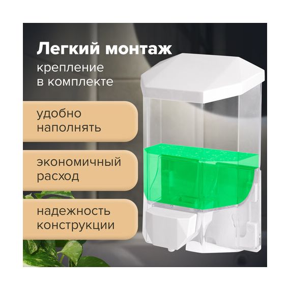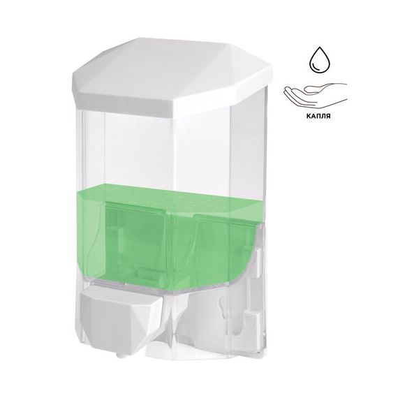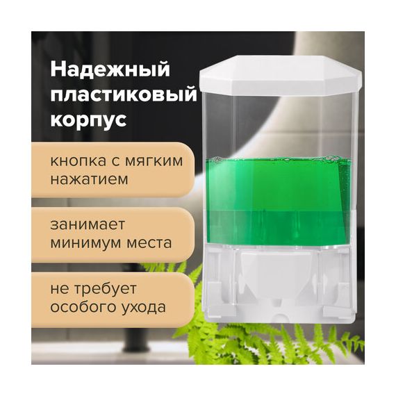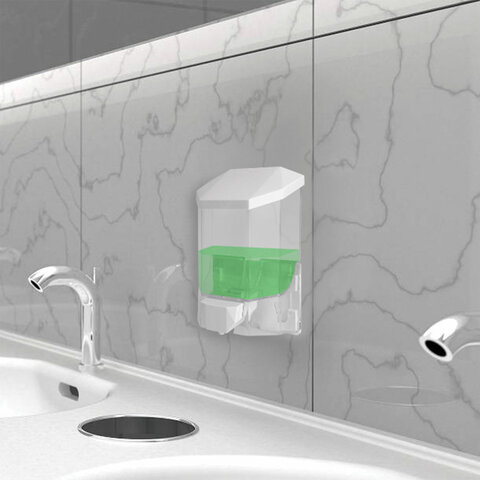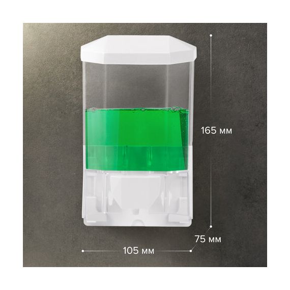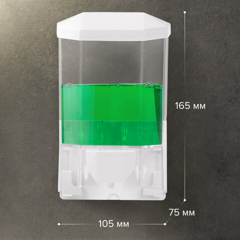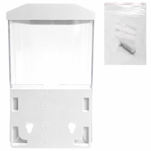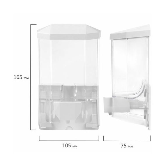 Дозатор из прозрачного пластика объемом 0,5 л обеспечивает высокую гигиеничность. Выдача мыла осуществляется экономичными порциями. Сочетается с расходными материалами других производителей. Имеется окно для контроля уровня мыла. Размер – 165х105х75 см. Крепежные материалы в комплекте.