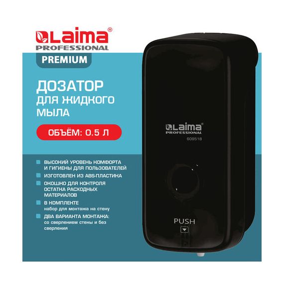Дозатор для жидкого мыла LAIMA PROFESSIONAL PREMIUM BLACK, НАЛИВНОЙ, 0,5 л, черный, ABS-пластик, 609518