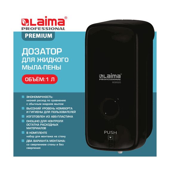Дозатор для жидкого мыла-пены LAIMA PROFESSIONAL PREMIUM BLACK, НАЛИВНОЙ, 1 л, черный, ABS-пластик, 609520