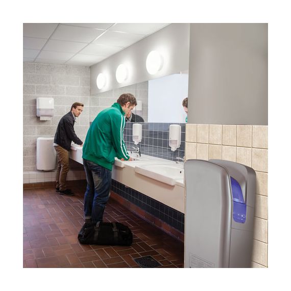 Руки становятся сухими за 6-8 секунд. Такой результат достигается благодаря высокой скорости воздушного потока и уникальной технологии подачи воздуха. Мощный двигатель создает поток воздуха скоростью до 95 м/с, который разделяется на две плоских струи так, что он фактически сдувает капли воды с рук за считанные секунды!