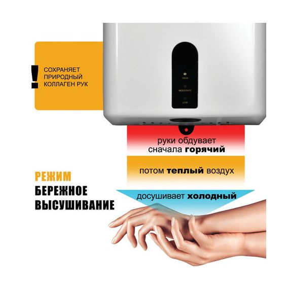 Корпус из прочного ABS-пластика сохраняет безупречный внешний вид годами, не желтеет и не тускнеет, а компактные размеры (210х120х260 мм) позволяют удобно разместить сушилку даже в ограниченном пространстве. Мощный воздушный поток (95 м/с) и регулируемый нагрев (23-65 °C) гарантируют сушку всего за 5-7 секунд, экономя время и исключая необходимость в бумажных полотенцах.