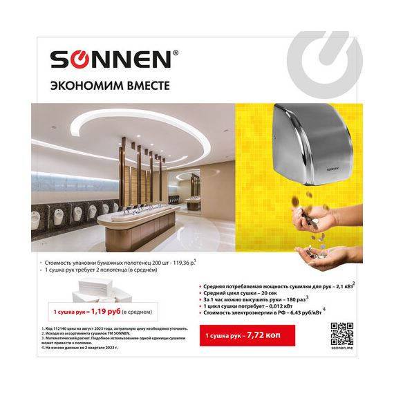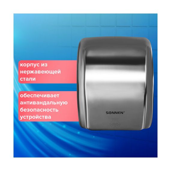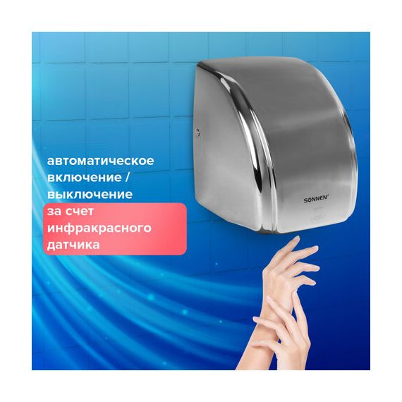 Сушилка для рук SONNEN HD-230S, 2100 Вт, нержавеющая сталь, антивандальная, хром, 604195