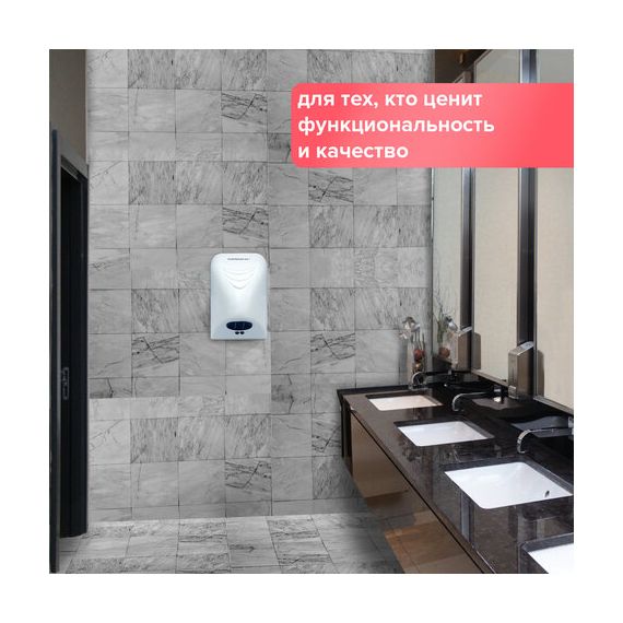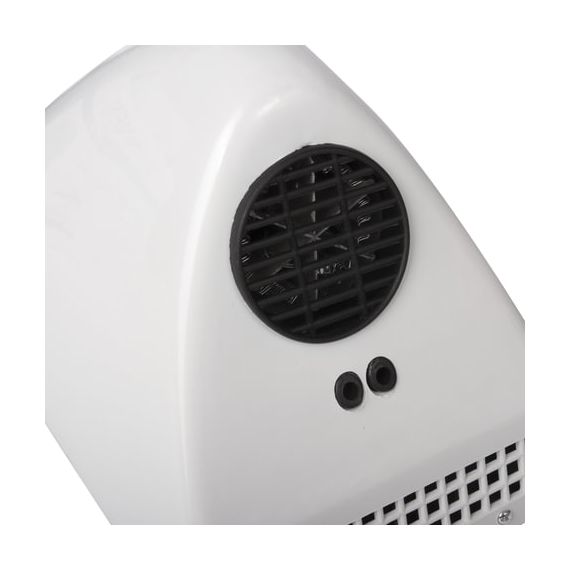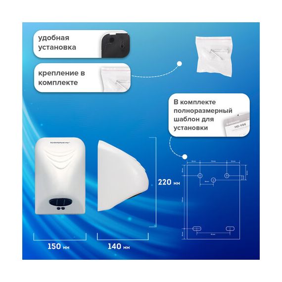 Мощность 850 Вт обеспечивает время сушки рук за 35 секунд. Стандарт IPX1 гарантирует защиту от брызг. Включается и выключается сушилка автоматически при помощи инфракрасного сенсора. Пластиковый корпус в белом цвете впишется в любой интерьер. В комплект входит набор для монтажа: шурупы с пластиковыми дюбелями, кронштейн и шаблон установки для удобства разметки точек крепления.