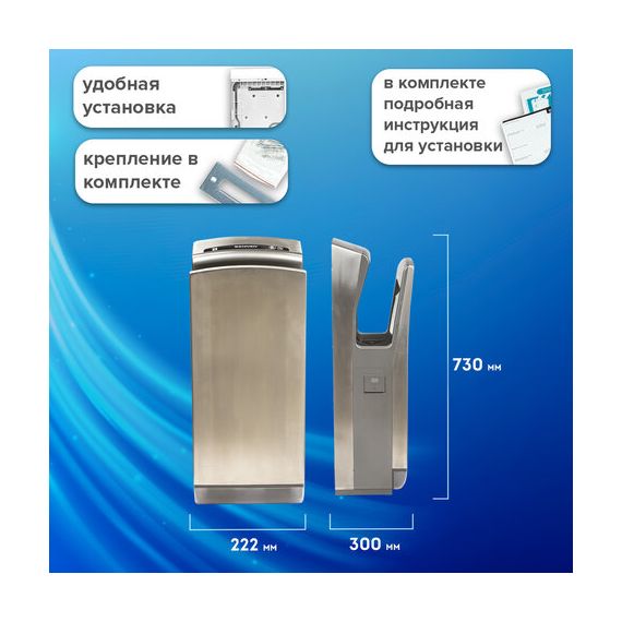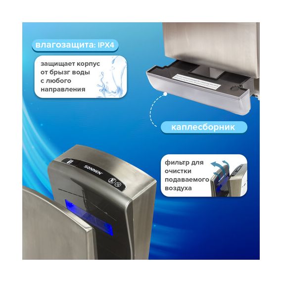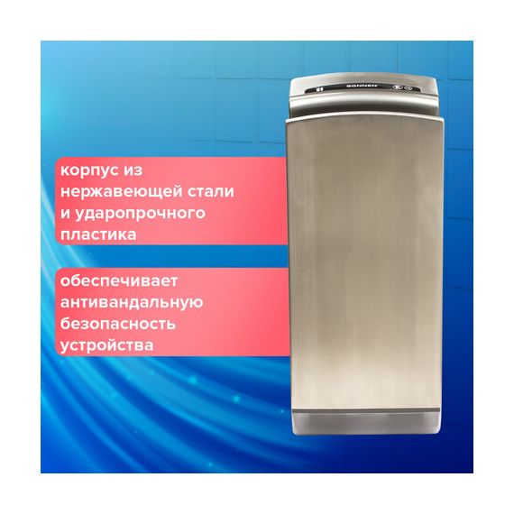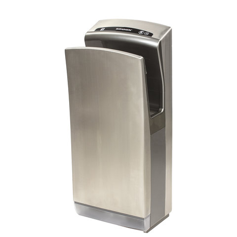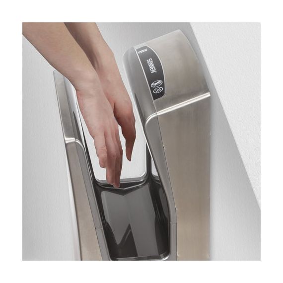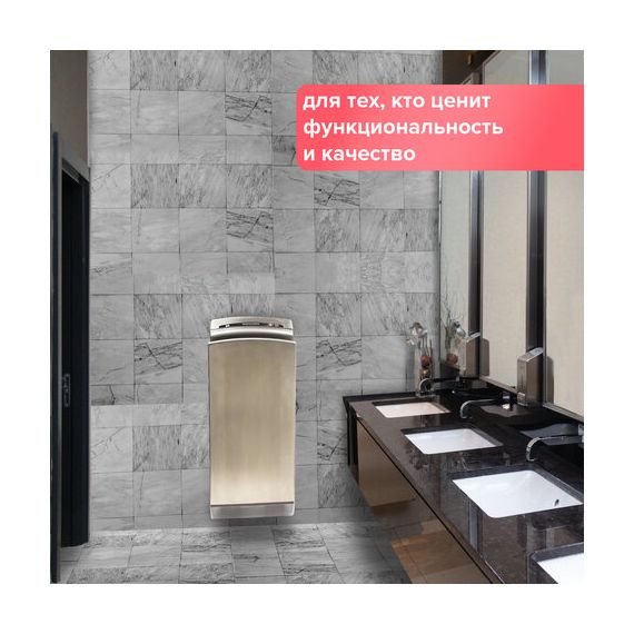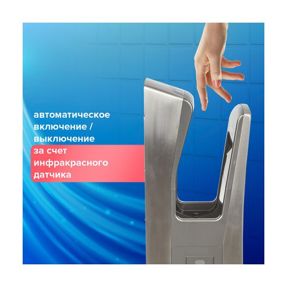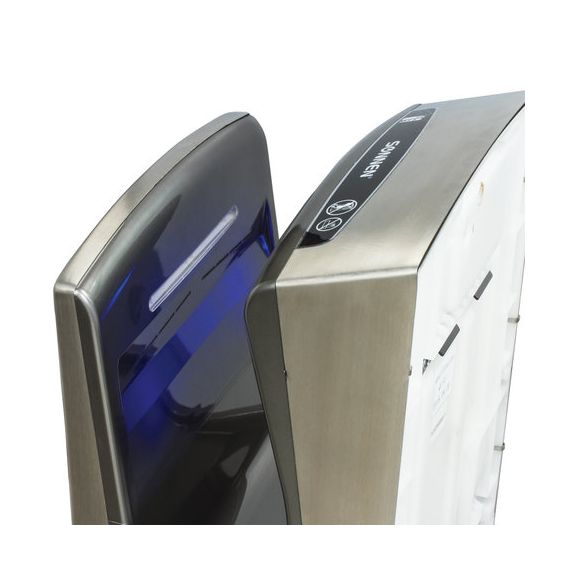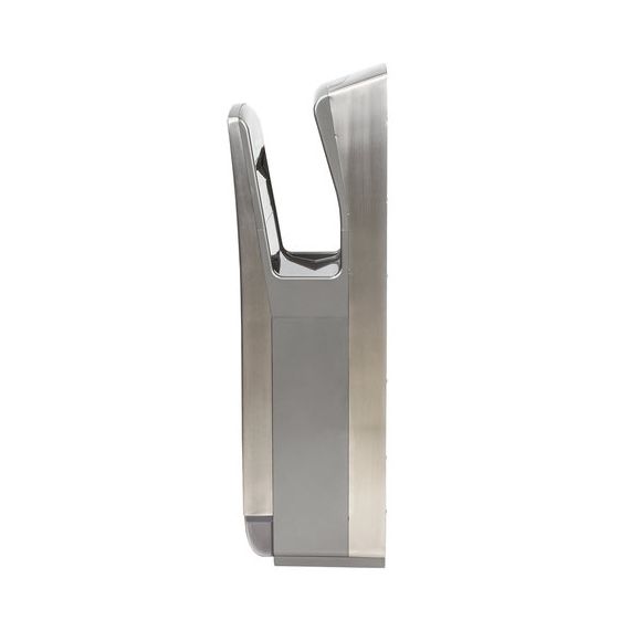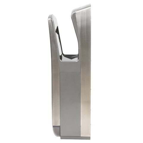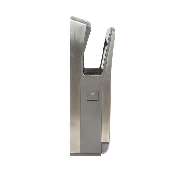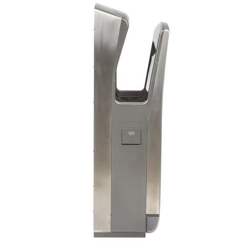 Мощность 1650 Вт обеспечивает время сушки рук за 10 секунд. Мощный поток воздуха подается на руки из тонких форсунок с двух сторон, в результате чего создается эффект срезания капель воды, и руки становятся сухими за несколько секунд, что обеспечивает максимальный уровень комфорта для пользователя. Данную модель отличает наивысший для подобного типа устройств класс влагозащиты – IPX4, что означает, что устройство защищено от брызг с любых сторон. Это полностью исключает вероятность короткого замыкания из-за попадания воды на корпус. Устройство оснащено каплесборником для получаемой после сушки рук воды и воздушным фильтром для очистки подаваемого воздуха. Корпус изготовлен из нержавеющей стали и ударопрочного пластика, что обеспечивает повышенную антивандальную безопасность устройства. В комплект поставки входит набор для крепления к стене.