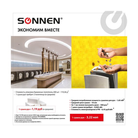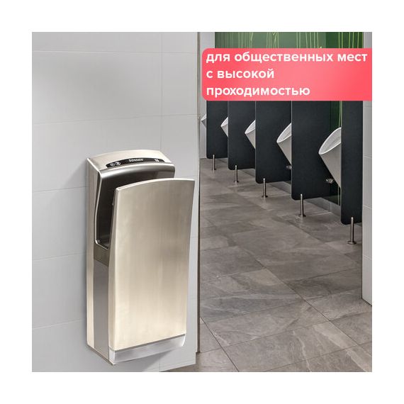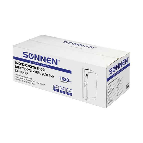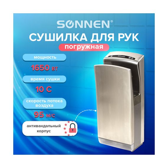 Сушилка для рук SONNEN K7, 1650 Вт, погружного типа, время сушки 10 секунд, нержавеющая сталь, антивандальная, 604750