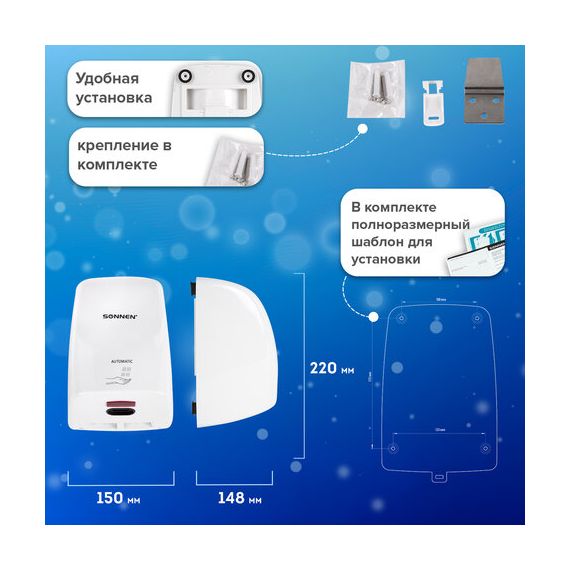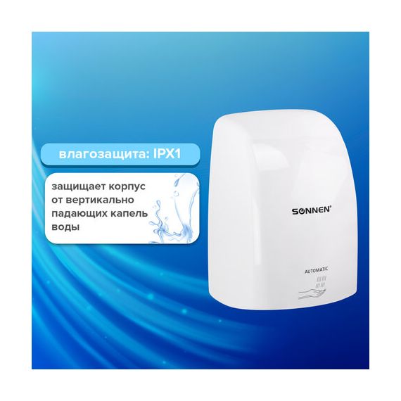 Мощность 1200 Вт обеспечивает время сушки рук за 15 секунд. Стандарт IPX1 гарантирует защиту от брызг. Включается и выключается сушилка автоматически при помощи инфракрасного сенсора. Пластиковый корпус в белом цвете впишется в любой интерьер. В комплект входит набор для монтажа: шурупы с пластиковыми дюбелями, кронштейн и шаблон установки для удобства разметки точек крепления.