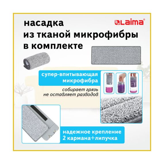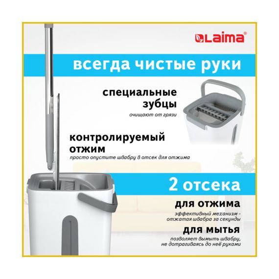 Система для уборки LAIMA PRO CLEAN оборудована двумя отсеками для чистой и грязной воды. Отсек для грязной воды оснащен чистящим механизмом, позволяющим практически моментально и полностью удалять со швабры мусор, собравшийся на ней в процессе уборки. Снимать и отжимать тряпку руками больше не нужно. Руки будут оставаться сухими и чистыми. Идеально подходит для мытья линолеума, паркета, ламината, мраморного и керамического пола. Плоская насадка легко достает до труднодоступных мест. Швабра оснащена долговечной насадкой из микрофибры - такая ткань хорошо впитывает воду, поэтому при мытье полов и других покрытий не остается разводов и пятен. С такой системой уборка будет более комфортной.