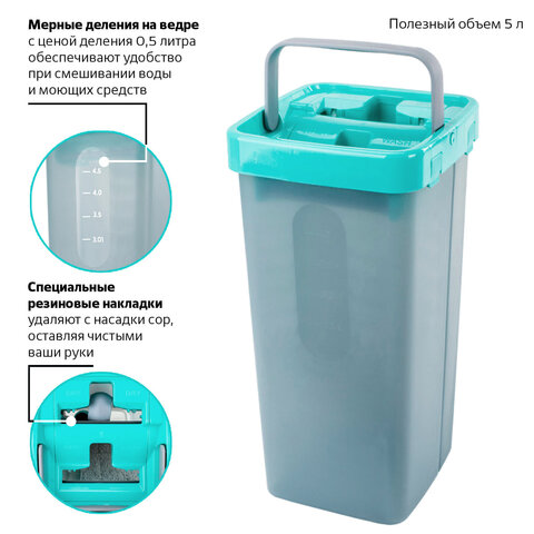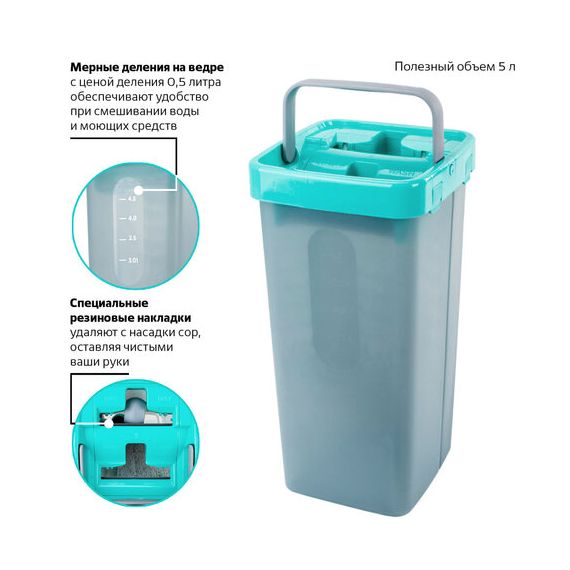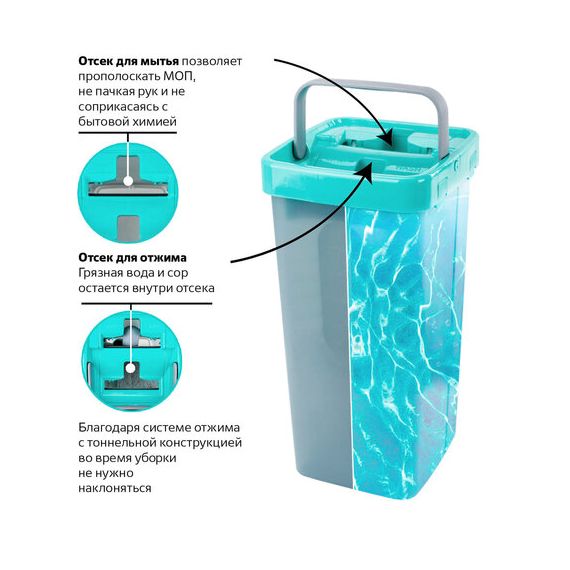 Набор состоит из прямоугольного ведра с двумя отсеками (первый отсек с чистой водой и второй отсек с туннельным отжимом для отжима МОПа, для сбора мусора и грязной воды). Отжим МОПа происходит посредством плотного прижатия флаундера в корпусе туннельного отжима. Для удобства хранения швабру можно разобрать на части и аккуратно сложить все элементы в ведро. Данный набор для уборки уникален своей компактностью и при этом очень функционален. Уникальность данного набора для уборки состоит и в том, что за счет трех составных частей черенка он становится универсальным: максимальная длина черенка равна 130 см, но если убрать одну часть, то длина становится 100 см. В комплекте идут 3 сменные насадки, которых хватит на долгое время использования. Также их можно применять для уборки разных комнат. Одна из двух частей ведра имеет мерные деления 3,0-4,5 литра с ценой деления 0,5 литра.