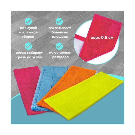 Моп имеет форму плоского прямоугольника, такая форма и чистящая поверхность из ворса длиной 0.5 см позволяет легко собрать грязь по углам и захватить большую площадь убираемой поверхности, что в свою очередь уменьшает временные затраты на уборку. Устойчива к износу. Выполнена из микрофибры.