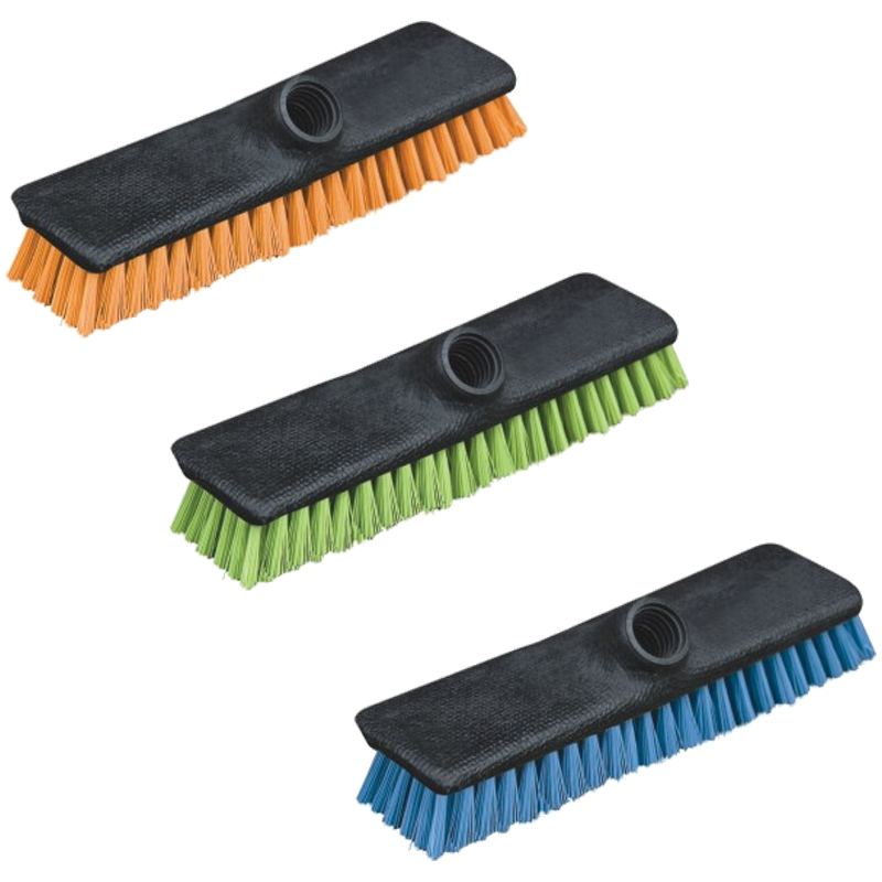 Щетка-скраббер имеет жесткую щетину, что делает ее незаменимой при уборке сильно загрязненных помещений. Резьба для рукоятки выполнена под углом для комфортной уборки. На основании щетки имеется пластиковый скребок для удаления особо стойких загрязнений. Универсальная щетка для любых пластиковых рукояток. Состав: полипропилен, щетина ПЕТ.