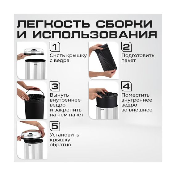 Внутрь ведра помещается съёмное пластиковое ведро с двумя ручками, изготовленное из PP. Ведро можно использовать как с пакетом для мусора, так и без него. При использовании пакета для мусора сначала необходимо снять крышку с ведра, поместить пакет внутрь, расправить его края таким образом, чтобы при помещении крышки на место она надежно прижимала края пакета.