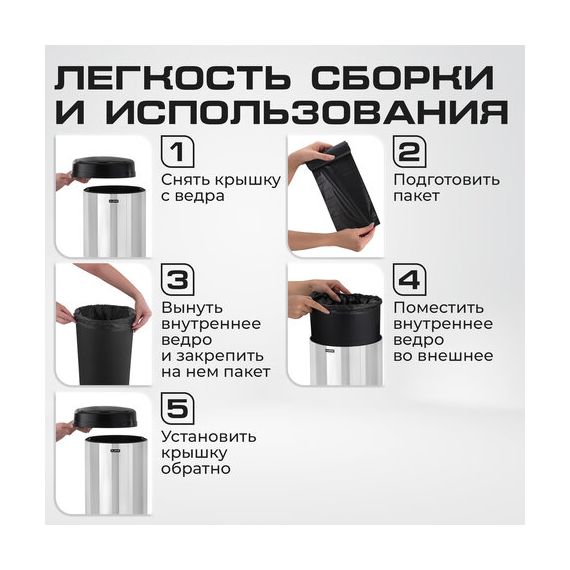 Внутрь ведра помещается съёмное пластиковое ведро, изготовленное из PP. Ведро можно использовать как с пакетом для мусора, так и без него. При использовании пакета для мусора сначала необходимо снять крышку с ведра, поместить пакет внутрь, расправить его края таким образом, чтобы при помещении крышки на место она надежно прижимала края пакета.