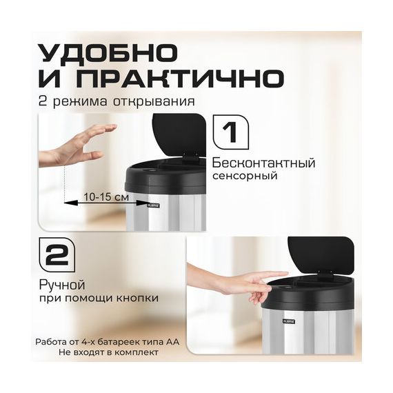 Крышка имеет два режима открывания – бесконтактный (сенсорный) и ручной (при помощи кнопки):