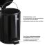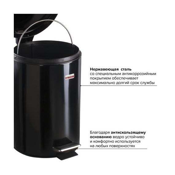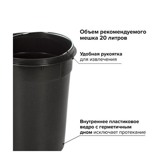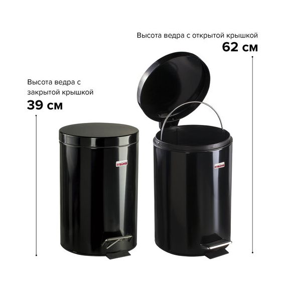 12 л - стандартный объем при средней проходимости. Оборудовано педалью для открывания. Крышка плотно прилегает, тем самым препятствуя распространению запахов. Внутреннее съемное пластиковое ведро имеет удобную рукоятку для извлечения. Изготовлено из нержавеющей стали со специальным антикоррозийным покрытием, что обеспечивает максимально долгий срок службы. Ведро устойчиво благодаря антискользящему основанию. Объем рекомендуемого мешка - 20 л. Контейнер для мусора в черном цвете с глянцевым покрытием имеет компактные размеры (39х25,2х25,2 см) и отлично впишется в любой интерьер.
